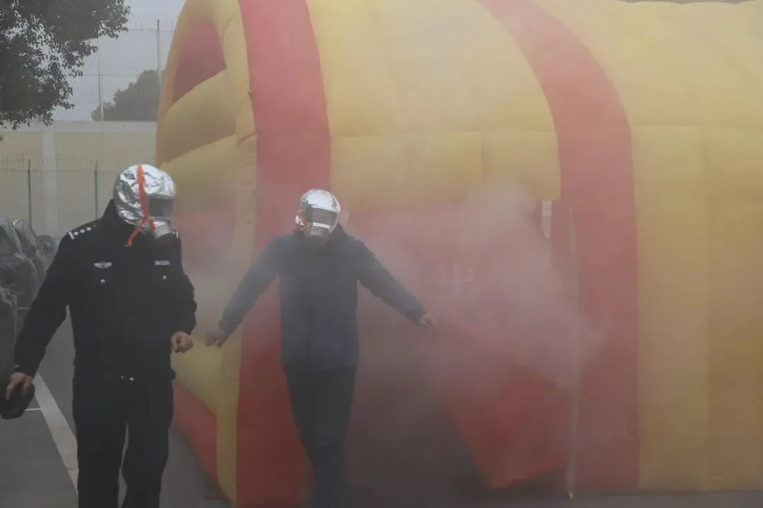 转场至南门逃生屋,实景体验瞬间拉满:帐篷内烟雾弥漫,能见度不足半米,每组3人依次进入。有人刚迈步就因起身过高被教官轻拍提醒“低头”,有人指尖贴紧墙面扶手、避开“拥堵段”,出口处安全员逐一点名确认。