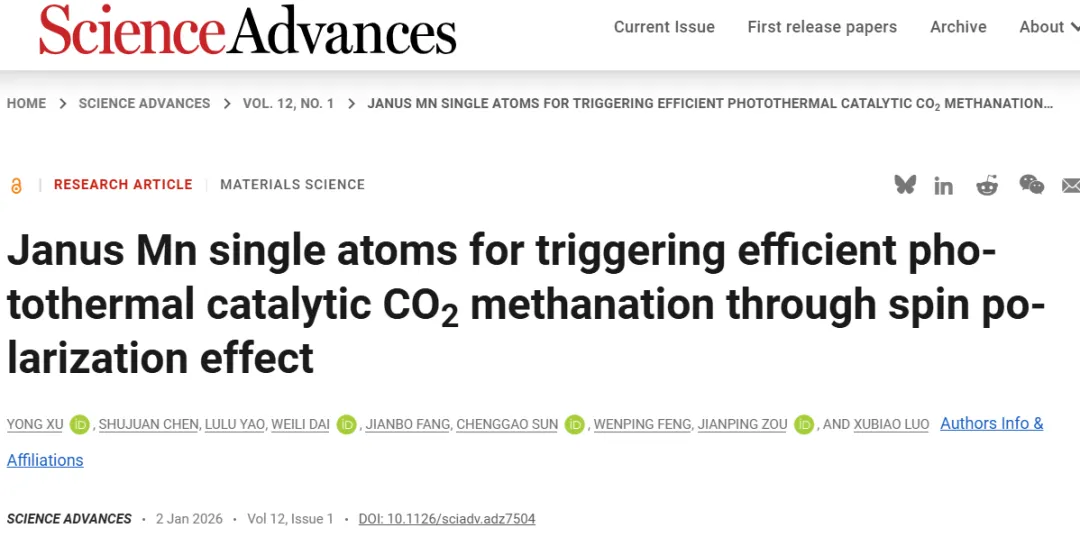 Yong Xu et al., Janus Mn single atoms for triggering efficient photothermal catalytic CO2 methanation through spin polarization effect. Sci. Adv.12, eadz7504(2026). DOI:10.1126/sciadv.adz7504