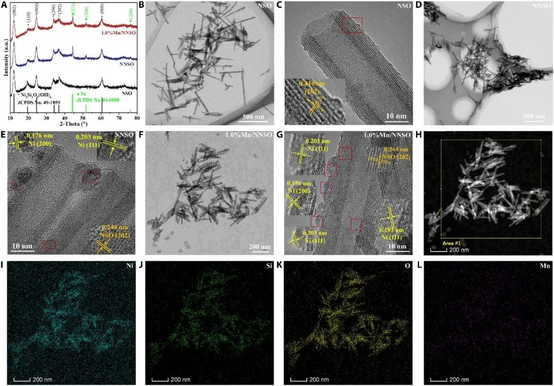 南昌航空大学代威力教授、中蓝长化工程科技有限公司孙成高团队研究者成功在空心硅酸镍纳米管(NNSO)表面构建了锰单原子位点,制备了光热催化剂1.0%Mn/NNSO。该催化剂中锰单原子的引入诱导了显著的自旋极化效应,从而产生内建电场,驱动光热电子从镍纳米颗粒向锰位点定向转移。