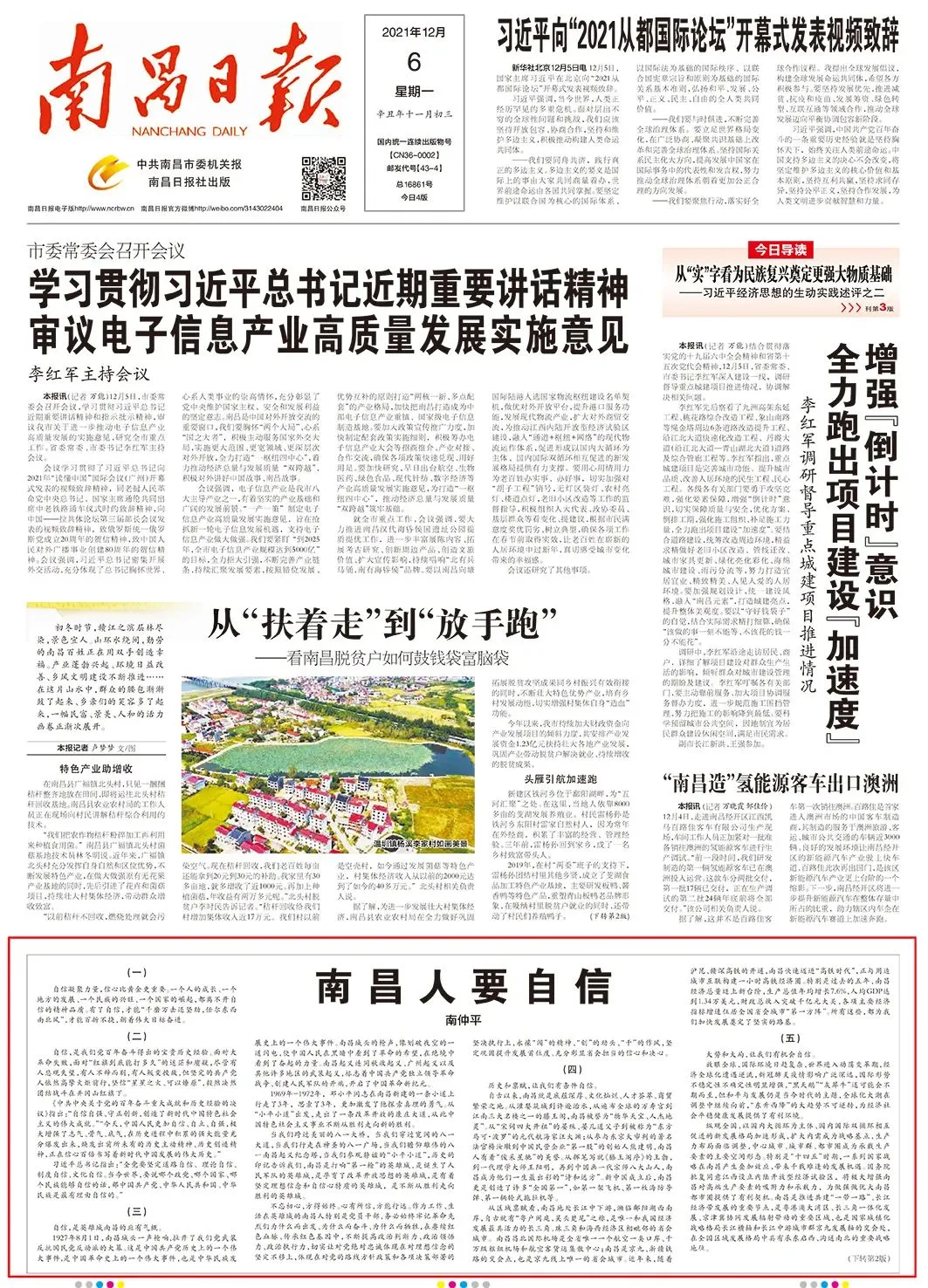 省会强则全省强,省会兴则全省兴,省会自信则全省自信。南昌人要自信,就是要自信地干,越干越自信。市委认真贯彻落实党中央决策部署,按照省委工作要求,制定了南昌发展的“施工图”,目标是把南昌打造成为引领全省高质量跨越式发展的核心引擎、支撑中部地区崛起的重要增长极、融入“双循环”新发展格局的重要枢纽和宜居宜业、宜学宜游的现代都市;路径是实现“五高”,即推动高质量跨越式发展、打造高颜值城市、推进高水平开放、创造高品质生活、实现高效能治理。 新时代赋予新使命、新征程呼唤新担当。625万多南昌人民对美好生活的向往,要求我们每个干部都要以“只争朝夕”的紧迫感,忠诚履职,求真务实,大胆作为。这是市委的要求,也是人民群众的期待,更是时代的使命和担当。美好的“施工图”彰显了我们南昌人的信心和决心,能不能变成美好现实,关键靠实干。自信地干,就是要主动干。切实增强省会意识,自觉定位一流、主动对标先进,实行公开晾晒成绩、公布目标举措等制度,营造你追我赶、争先创优的浓厚氛围。 自信地干,就是要靠前干。大力弘扬“脚上有土、心中有谱”的工作作风,积极践行“一线工作法”,坚持在一线指挥协调、在一线解决问题、在一线推动工作。 自信地干,就是要创新干。在困难面前不退缩,问题面前不推诿,敢于“啃硬骨头”、敢于“第一个吃螃蟹”,敢想敢干、敢闯敢试,做到“功成不必在我,功成必定有我”。 自信地干,就是要团结干。众人拾柴火焰高,众人划桨开大船。团结出生产力,团结出战斗力,团结出干部。要像一块钢板一样团结在一起,打造一支有干劲、有思路、有办法、有活力的“四有”干部队伍,形成干事创业的强大合力。 “自信人生二百年,会当水击三千里”。让我们把蕴藏的勃勃生机迸发出来,把喷薄欲出的能量激发出来,奋力实现“率先‘作示范、勇争先’,再展英雄城雄姿,续写新的时代荣光”。