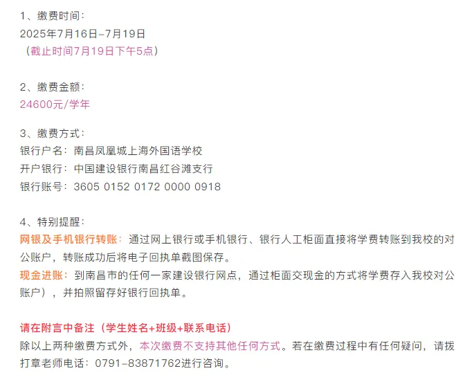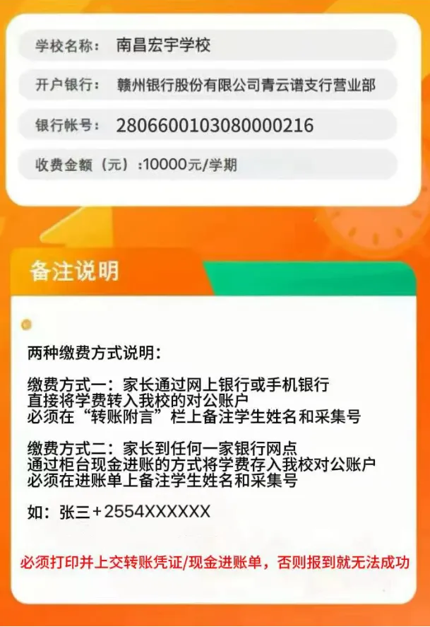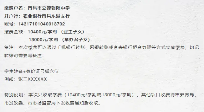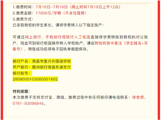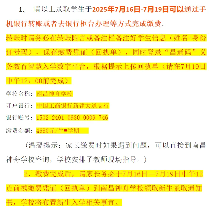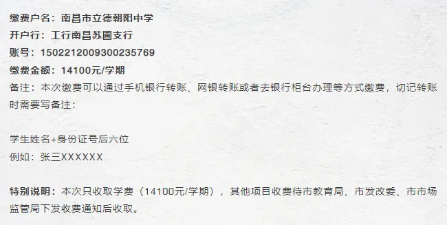 南昌市麻丘高级中学2025级初一年级新生缴费公告