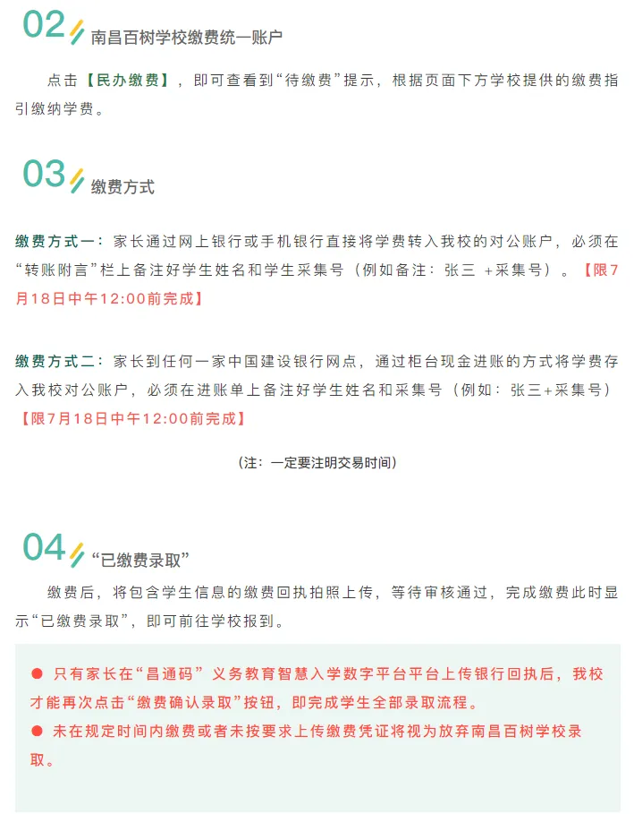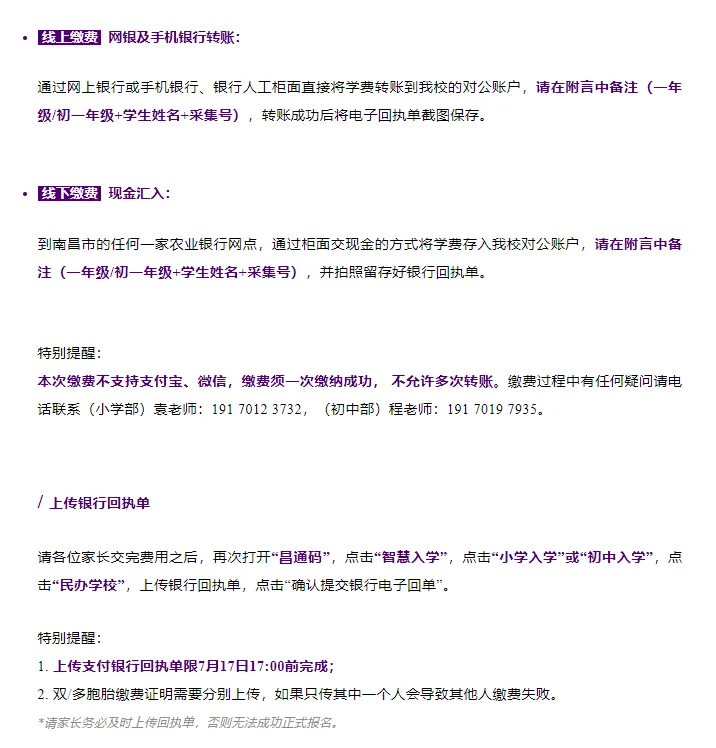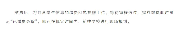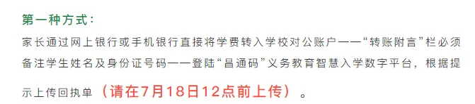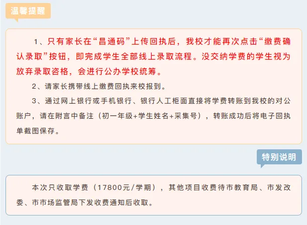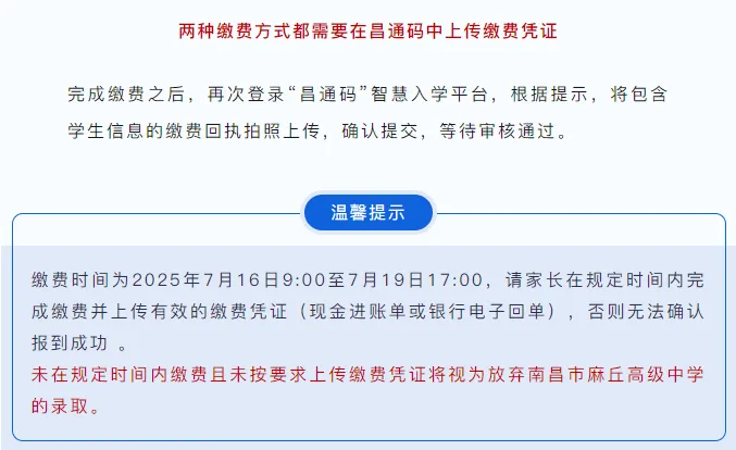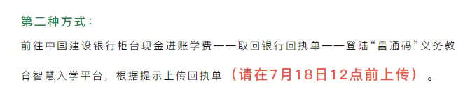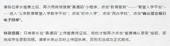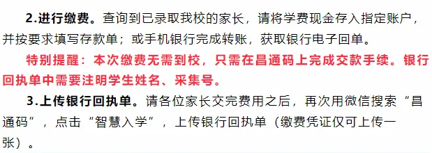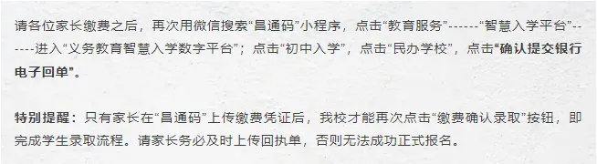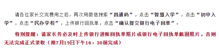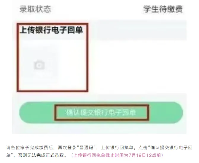 及时上传银行进账回执单照片或银行电子回执单截图照片。只有家长在“昌通码”中“智慧入学”平台上传银行回执后,学校才能再次点击“缴费确认录取”按钮,即完成学生全部录取流程。