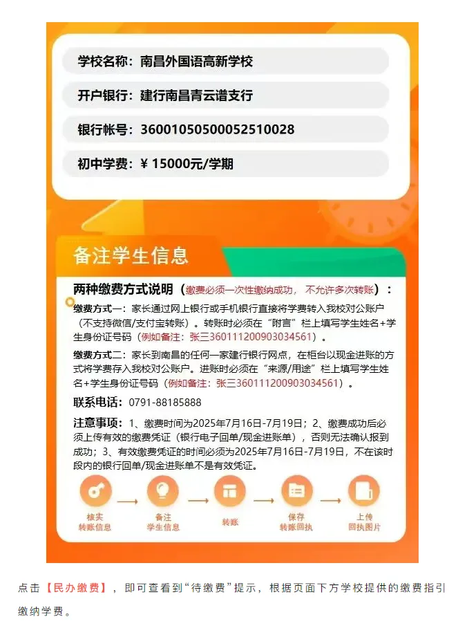 南昌外国语高新学校2025级初一年级新生缴费录取流程