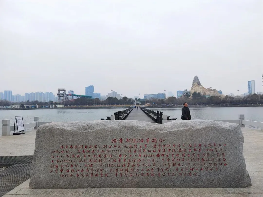 从通往万寿宫的拱桥上眺望,北面湖心还有一座小岛,岛上有飞檐青瓦隐现,看景区导览图,知道那就是近年新建的豫章书院。江西自古书院兴盛,享有“江右书院甲天下”之美誉。自唐至清,全国有据可查的书院共7300余所,其中江西以989所位居首位,文化底蕴深厚,绵延至今。九江庐山的白鹿洞书院、吉安的白鹭洲书院、上饶铅山的鹅湖书院与南昌的豫章书院齐名,合称“江西四大书院”。豫章书院作为江西四大书院之一,始建于南宋,历经兴废,见证了江右文化的繁荣与发展。这里曾迎来朱熹、陆象山等理学大师,他们的讲学足迹为书院留下了深厚的文化底蕴。为进一步完善公共文化服务体系,浓厚城市书香氛围,提升城市文化影响力,2025年,南昌市在象湖重建书院。南昌市依托象湖湖心岛仿古建筑恢复豫章书院,构建了一个集读书、研学、交流、休闲等功能于一体的新型公共文化空间。湖畔矗立一座牌坊,上书“豫章书院”几个遒劲大字,两边立柱对联:“水可清心远思千载 书能益智多读数行”。仁者乐山,智者乐水,在碧波荡漾的湖心岛上建一座幽静的书香雅苑,正合了闹中取静之意。通往书院的将军桥全长175米,采用浮桥结构,39艘钢浮船整齐排列于水面,撑起桥身。微风拂过,桥身轻晃,如坐船行于水上。下浮桥后,首先映入眼帘的便是刻着“章水文渊”的石碑,四个字背后,承载着豫章书院近千年的历史。碑文记载,豫章书院创自南宋。明万历间,巡抚凌云翼、潘季驯先后修葺,后更名为豫章二十四先生祠。清康熙五十六年(1717年),巡抚白潢即旧址重建书院。1719年,康熙御赐豫章书院"章水文渊"匾额,加之朱熹、陆九渊、赵汝愚、王阳明多人在书院讲学,书院由此名声大振。雍正十一年(1733年),建为省会书院。乾隆七年(1742年)巡抚陈宏谋制订《豫章书院学约》十则,发至省内各书院仿照执行,遂为阖省书院通规。光绪二十八年(1902年),改为江西大学堂,旋改江西高等学堂。民国时期,改为工业专门学校、省立甲种工业学校等。历史深处的豫章书院旧筑早已湮没,湖心岛上的仿古建筑也曾长期闲置。南昌市依托象湖湖心岛仿古建筑恢复豫章书院,成为集读书、研学、交流、休闲等功能于一体的新型公共文化空间,营造浓厚城市书香氛围,提升城市文化影响力。数百年后的今天,穿梭于游廊间,伫立在书房里,仿佛依然能够聆听到历史的不绝回响,触摸到书院绵延而深厚的文脉。复建后的书院总用地面积约1.9万平方米,总建筑面积4136.53平方米。书院设有豫章堂、钟陵轩、隆兴斋、洪都厅、雅望亭等建筑。主体建筑豫章堂为深度阅读空间,纸墨清香静待知音;洪都厅、隆兴斋匠心独运,用于开展专家讲学与学术交流;钟陵轩视野开阔、雅望亭临湖而建,可供文创雅集、休憩品读。在这里,传统书院的空间美学与现代都市的创新活力交织共鸣,成为一座立体的、活态的城市文化磁场。豫章书院纳入全市公共阅读生态系统,书院主体建筑豫章堂为开放式三层公共阅读空间,静谧典雅。传统书院以藏书、讲学、祭祀为主,是相对封闭的学术共同体,主要服务于士人阶层。而在现代语境下,豫章书院实现了功能重构:从“象牙塔”走向“城市客厅”,从“精英专属”转为“大众共享”,成为集阅览、自习、研学、交流等功能于一体,神形兼备的新型公共文化空间。青砖石基,朱漆门柱,金匾额枋,绿琉璃瓦,这座易址重建的书院静立于碧波环抱之中,它不仅是历史的标本,更成为一条连接过去与未来的文化动脉,让这座豫章故郡、洪都新浮的千年文脉得以赓续。往期回顾: