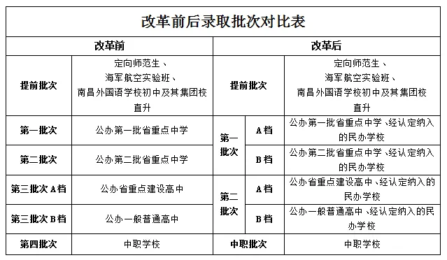 答:改革后,原有公办普通高中第一批次和第二批次合并为一个批次,设定为第一批次,分 A 档和 B 档;原有公办普通高中第三批次 A档、B 档维持不变,设定为第二批次A档、B 档。