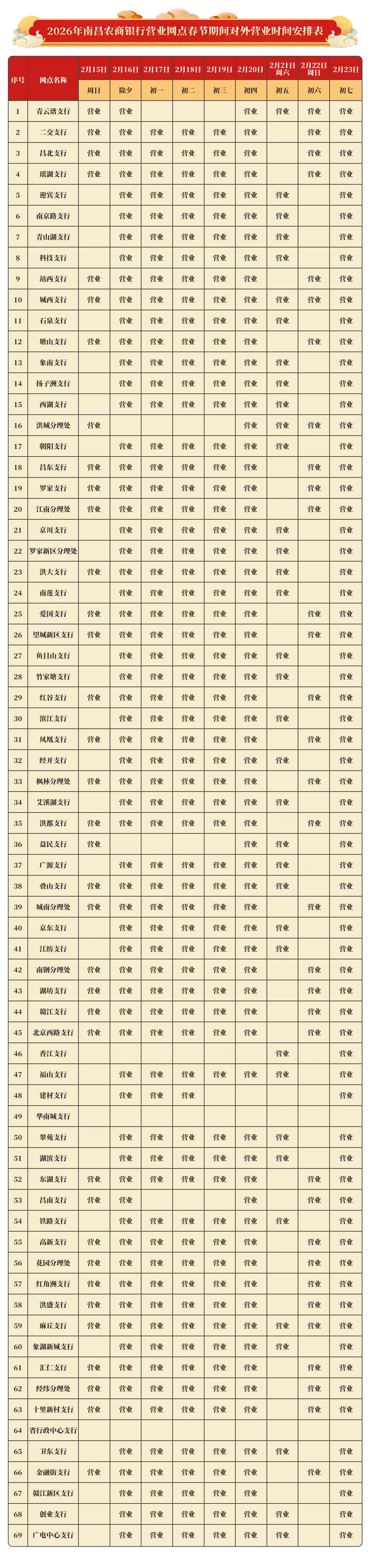 为方便您在春节期间前往南昌农商银行营业网点办理业务,现将各网点营业时间公告如下: