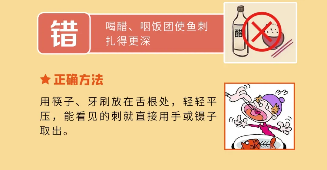 如果误吞鱼刺,千万不要喝醋、吞饭团。可以用勺子压住舌头,用镊子或手指取出。如果无法取出,第一时间到医院。温馨提醒:在春节聚餐畅享的同时,一定要注意预防异物卡喉
