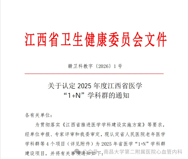 省医学“1+N”学科群建设项目,是省级推动医学优质资源整合、打造学科高地的核心举措,旨在以优势学科为核心,联动多学科协同发力,构建诊疗、科研、教学融合发展的一体化创新平台。此次南昌大学第二附属医院的“泛血管疾病学科群”成功入选,充分彰显了心血管内科在泛血管疾病诊疗领域的引领能力,也体现了学科群跨学科协作的创新实力。