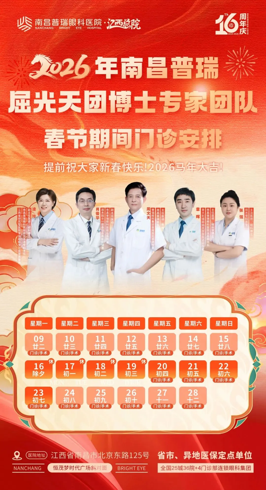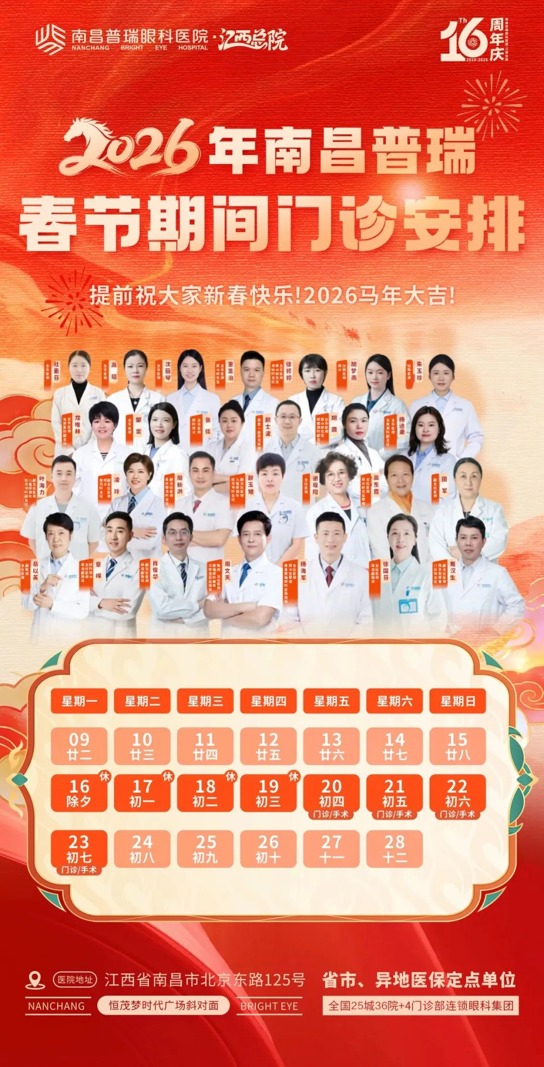 根据《国务院办公厅关于2026年部分节假日安排的通知》精神,结合我院实际情况,2026年春节期间我院放假及门诊工作安排如下: