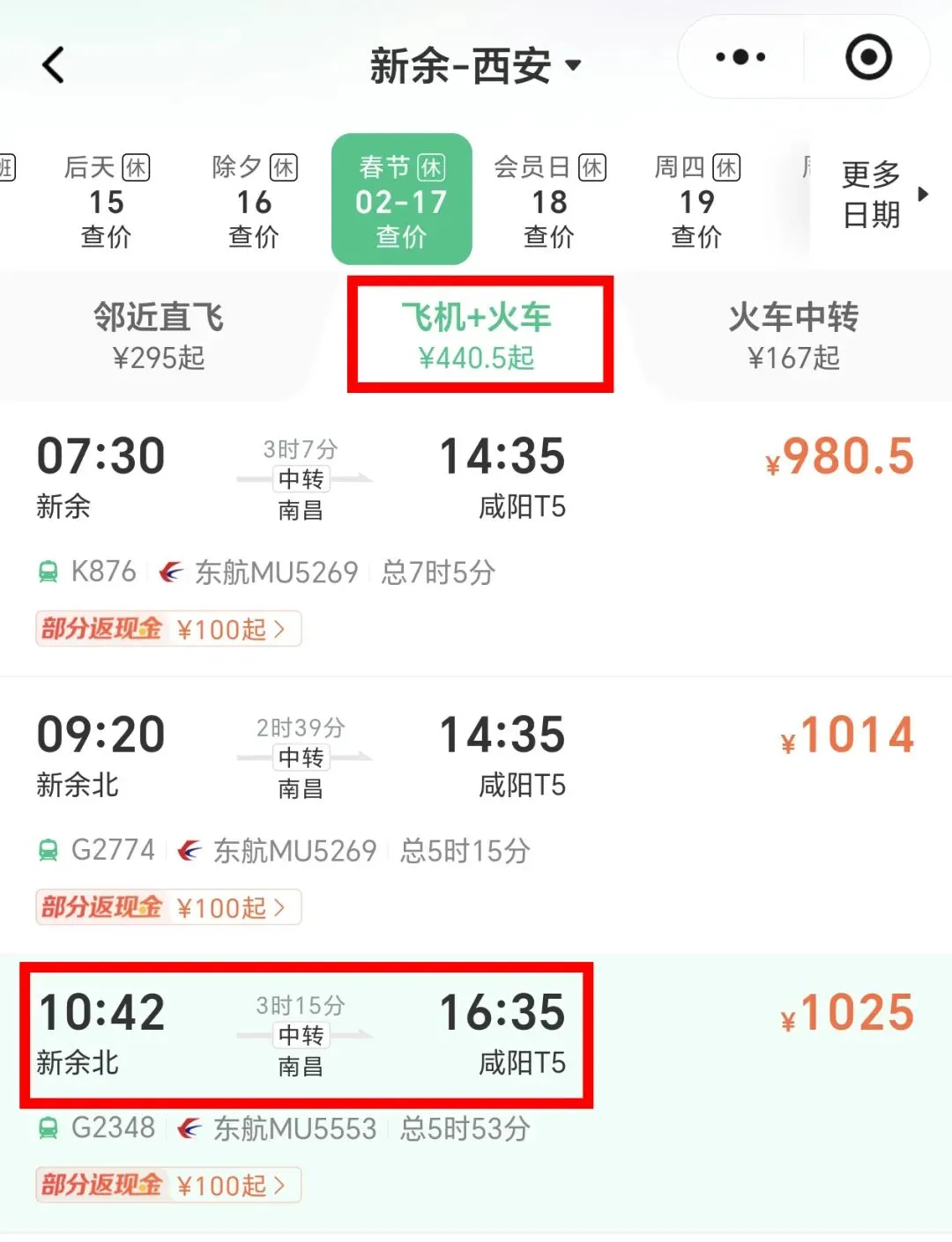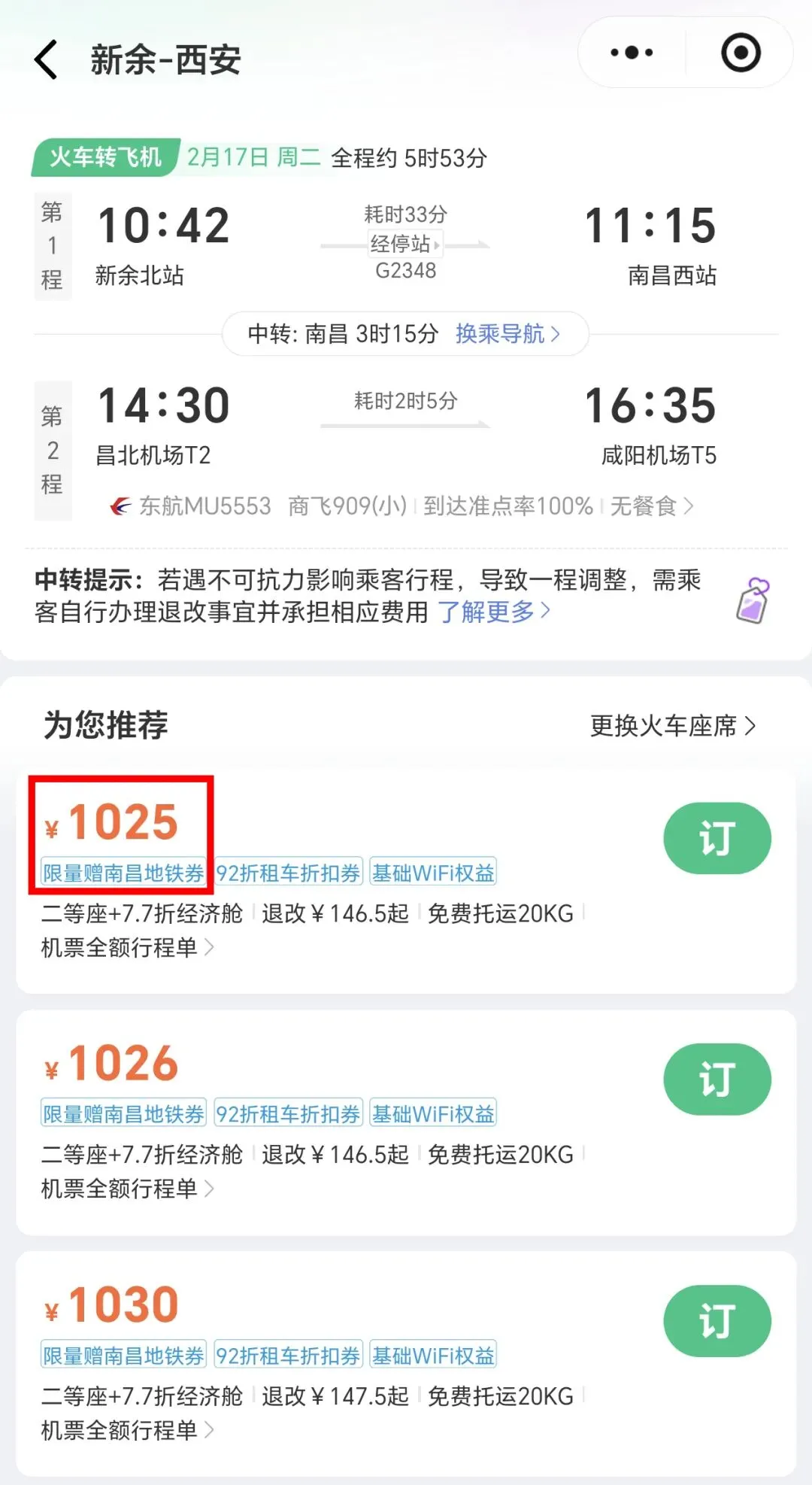 挑选中转站是南昌机场且带有“限量领南昌地铁券”的方案。