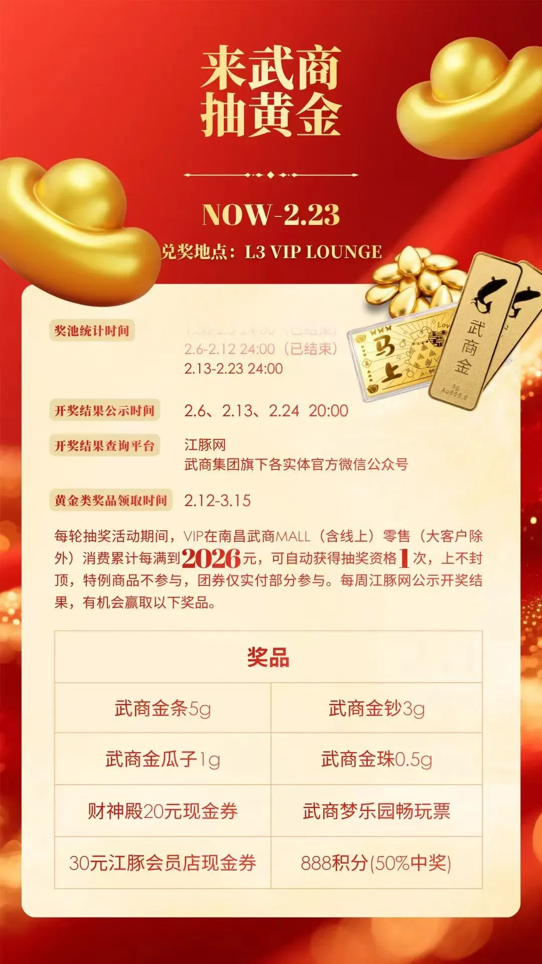 “来武商 抽黄金”互动,成了人气最旺、惊喜不断的新春重头戏。1月30日-2月23日,金条、金钞、金瓜子、金珠轮番送出,逛街就能把一整年的富贵吉祥都带回家。来武商,把好运、福气、财气统统拿捏,沉浸式感受热闹又暖心的红火大年。