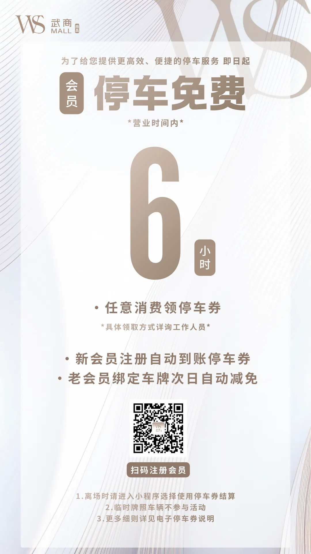 新春逛享无忧,贴心福利早已为你备好:商场每日营业时段10:00-22:00内,武商VIP即可享受免费停车6小时优惠。会员注册全程免费,只需完善个人信息、提前绑定车牌,就能轻松解锁便捷出行体验。