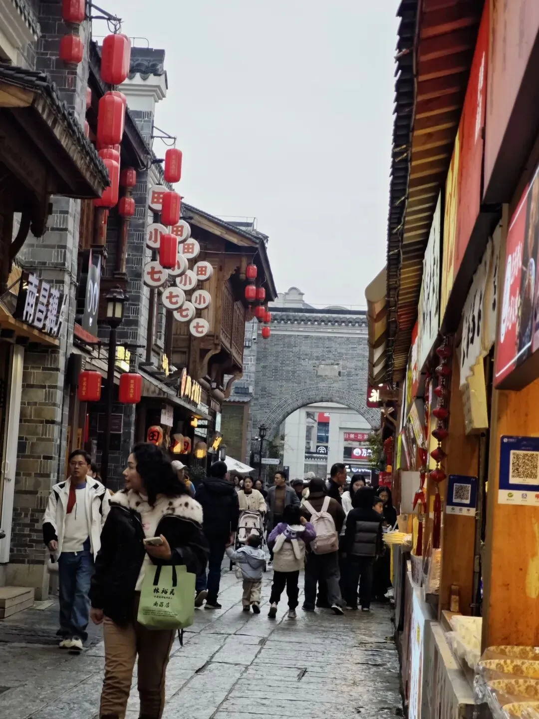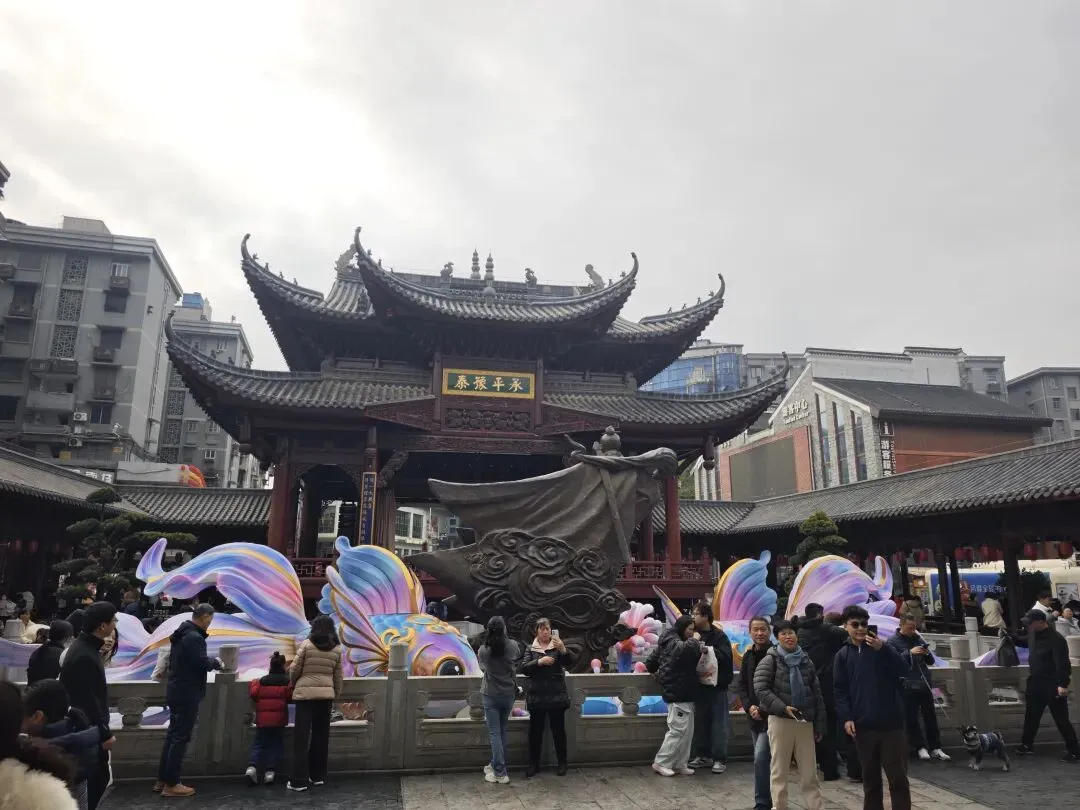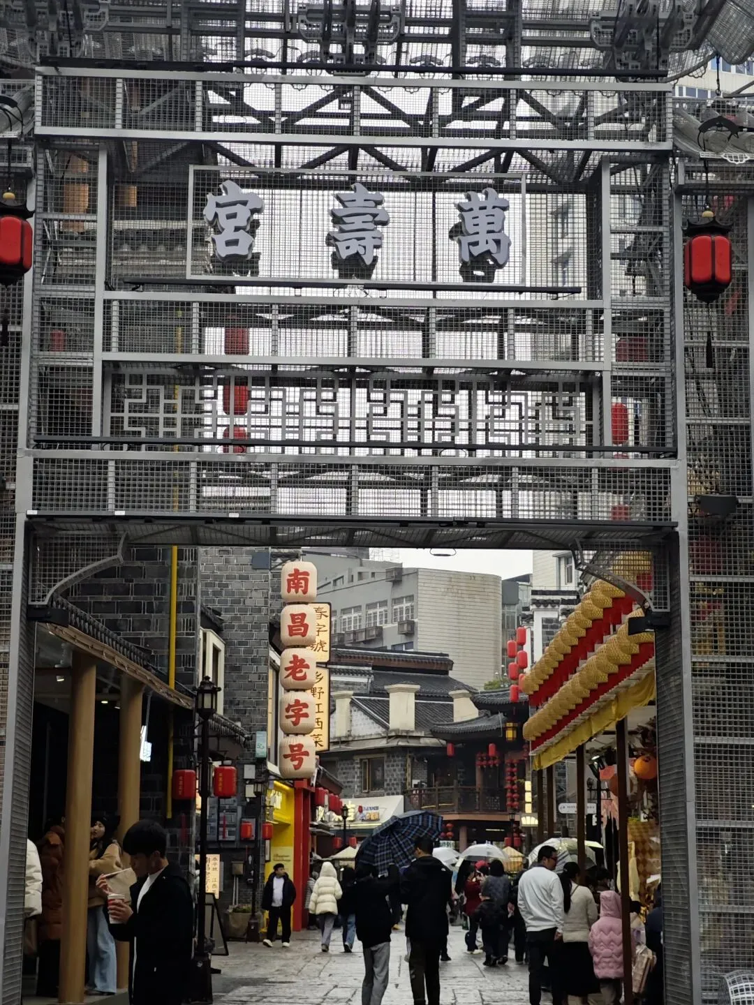 到处都是的洪都大拇指,去年在南昌高铁站喝过,口感和霸王茶姬差不多,都是茶底为主的奶茶吃点小吃,可以开始逛万寿宫了。万寿宫已有1700多年的历史,为纪念“江西福主”许逊而建,“神功妙济真君”的“许真君”指的就是他。进去右边是白虎祠,左边是青龙祠的风水位。里面很大,真君殿,玉皇殿,三宫殿,药王殿。另外万寿宫是属于道教殿,进去不要乱拜,和佛教是不一样的。建议有条件的可以请个讲解,不然就只能当是个普通建筑看看就出来了。带小朋友的难处就在这,呆不住,到处跑,一会就要出来了。有时间的话真的可以好好了解一下听听讲解,挺有意思的。我们就只能是逛一下就出来了。然后就在旁边逛吃逛吃 万寿宫的历史故事估计没几个人知道,但它吃的是真的多,必打卡之一的KUNTEA鲲茶万寿宫店,这种茶类奶茶特色就这样,这家店晚上可以听戏曲,早去可以占个好位置。这家臭豆腐不错,面皮脆脆的,味道属于辣甜辣甜,我们过去的时候还排上队了(大肉串一般般)吃得是很多,但味道就那样,景色白天也不错,天气不怎么好,有点灰灰,下午就开始下雨了我们还转场到八一广场,坐两个地铁站,出来就是江西省美术馆,没预约到号,只能在门口看看了累了累了,打道回府。南昌的冬天碰到下雨确实冷啊,期待下次能遇见蓝天白云。