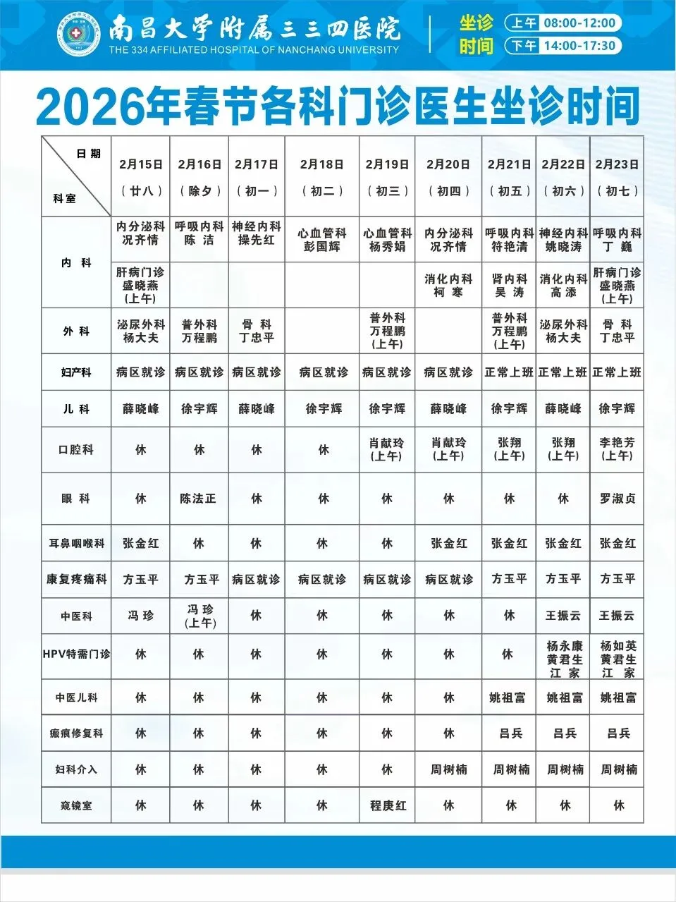 新春安康,守护常在 | 南昌大学附属三三四医院2026年春节假期门诊排班公告