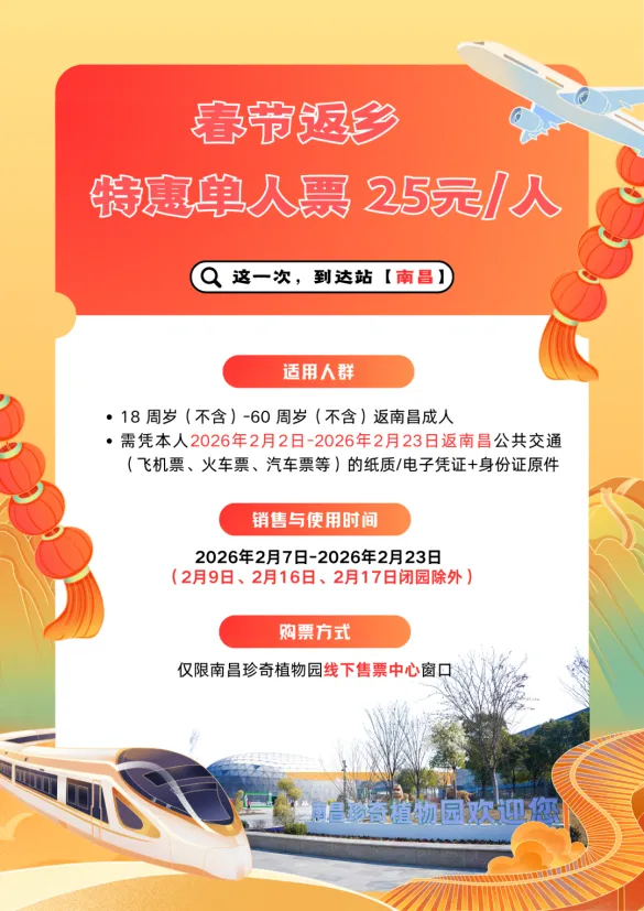 Ps:活动期间(2月15日至2月23日),2月16日-2月17日闭馆,请合理安排游园时间,避免跑空哦。更多资讯可关注“南昌珍奇植物园”微信公众号。