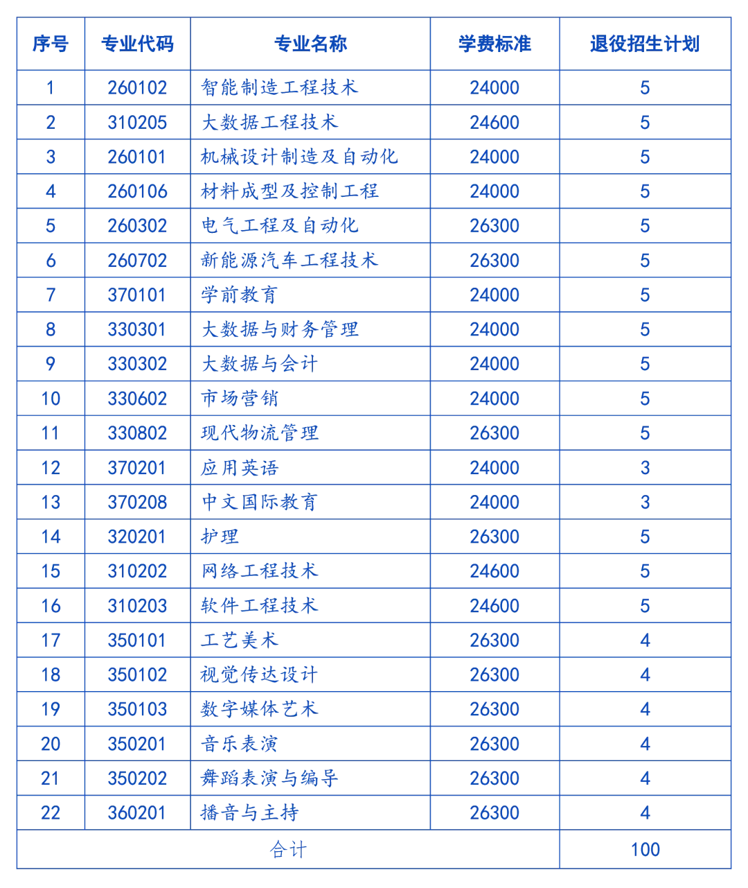 我校2026年专升本免试退役大学生士兵招生计划100名。