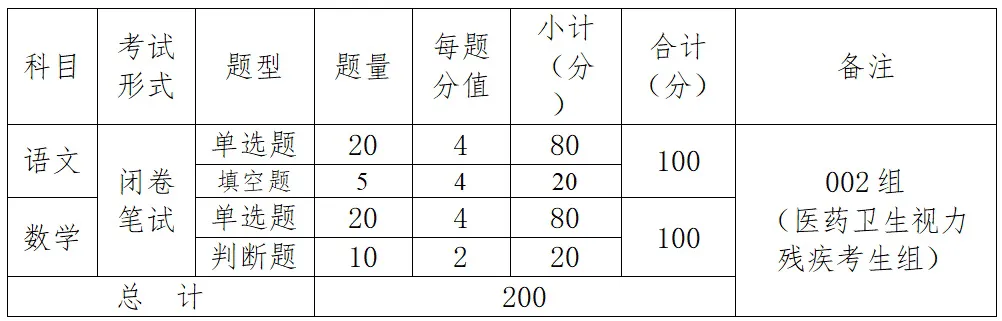 • 002组(视力残疾):技能校考同001组;另加文化校考(语文、数学,各100分)