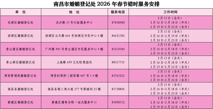 婚姻登记实现全域通办,内地居民可在南昌任意婚姻登记处办理结婚登记,无需居住证、无需户口簿,真正实现“跨省办、就近办、便捷办”;涉外、港澳台居民婚姻登记按专属规定办理,可咨询省民政厅涉外婚姻登记处(联系电话 0791-86350347)。