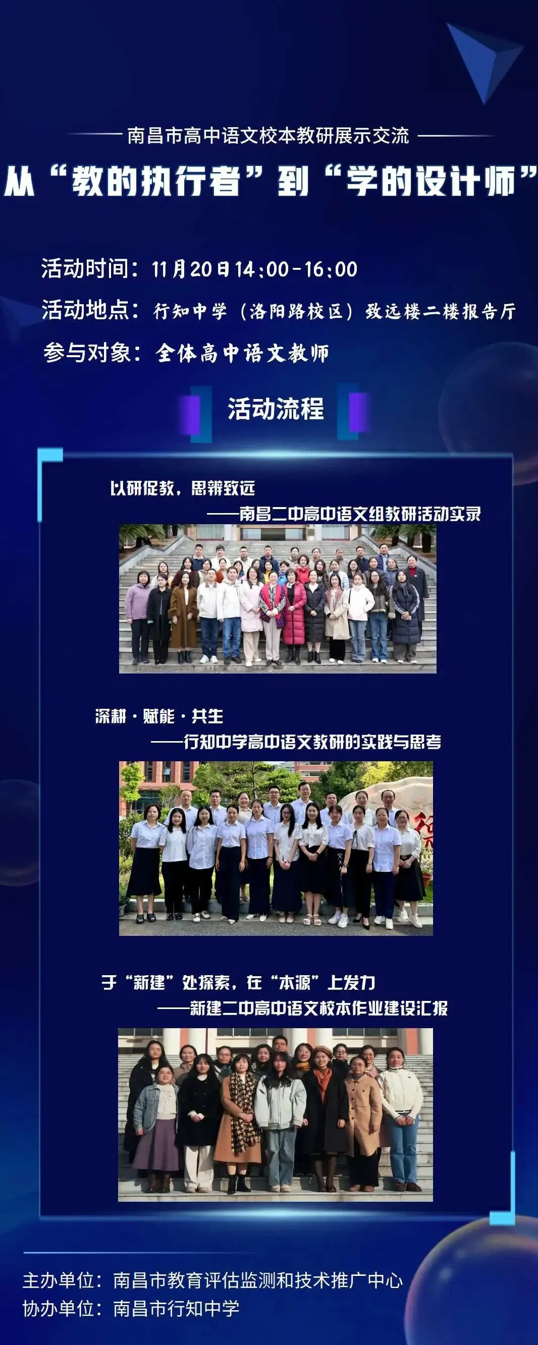2025年11月20日,南昌市教育评估监测和技术推广中心在行知中学举办了一场题为“从‘教的执行者’到‘学的设计师’”南昌市高中语文校本教研展示交流活动。南昌二中围绕着“以研促教,思辨致远”这一主题进行了语文组教研活动实录。本次活动聚焦作文教学中“如何引导学生写出深刻文章”这一核心议题,由高一、高二、高三教师共同参与,打破年级壁垒,实现教学智慧的有效融合与贯通。活动伊始,主持人谢颖老师以一道思辨类周练作文题为切入点,引出本次备课的核心目标:引导学生写作中学会深度阐释概念与构建逻辑关系。她指出,作文不仅是语言表达的训练,更是思维品质的体现,唯有打通各年级教学关节,方能实现写作能力的持续进阶。