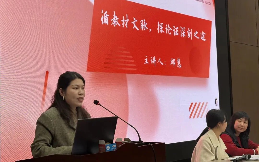 随后苏圃路校区高一年级邱慧老师进行中心发言。邱老师主要聚焦于基础年级的议论文的提升路径,以教材为桥,让经典文本与写作实践深度共鸣。从议论文中学论证巧思,从文学文本中练本质追问,从历史文化类课文中悟现实关联,其发言立足教学本源、案例鲜活,干货满满,精准呈现了读写结合、教考衔接的教学理念。