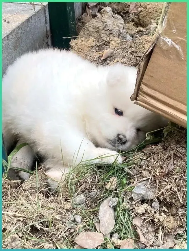 昨天下午.我送完货经过老城区那条巷子,看到一只白色.的东西蜷在垃圾堆旁边,我以为是一堆塑料袋,走近了才发现是一只萨摩耶,那一刻我心脏都抽紧了,这么热的天它趴在地上一动不动,我喊它它只是抬了抬眼皮看我,连叫都叫不出声。