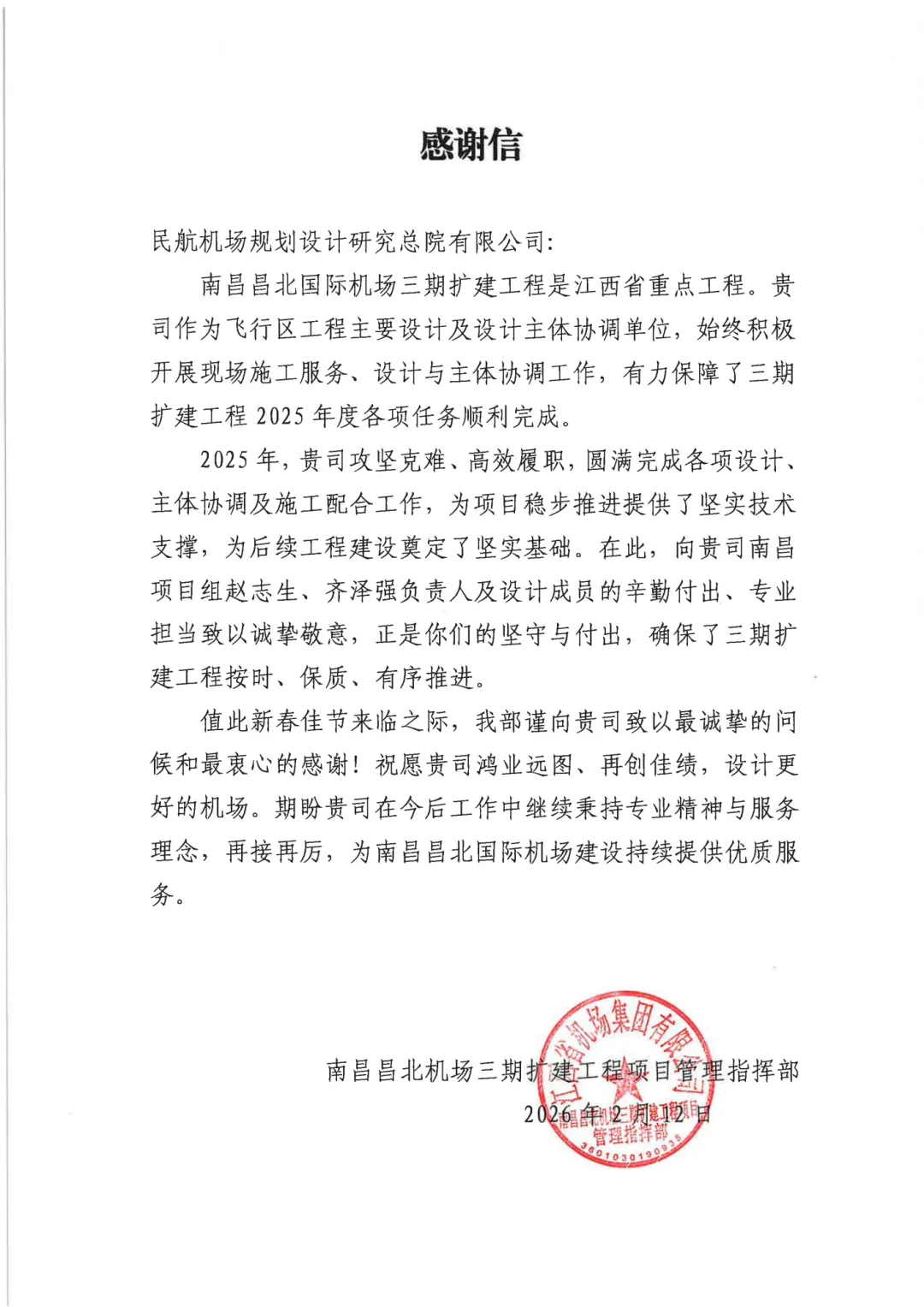 2月12日,南昌昌北机场三期扩建工程项目管理指挥部向民航总院发来感谢信,对民航总院作为飞行区工程主要设计及设计主体协调单位,积极开展现场施工服务、设计与主体协调工作,有力保障三期扩建工程2025年度各项任务顺利完成表示衷心感谢。