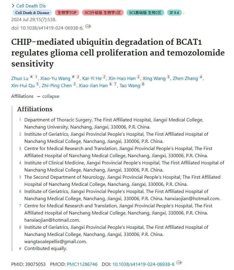 题目:CHIP-mediated ubiquitin degradation of BCAT1 regulates glioma cell proliferation and temozolomide sensitivity
