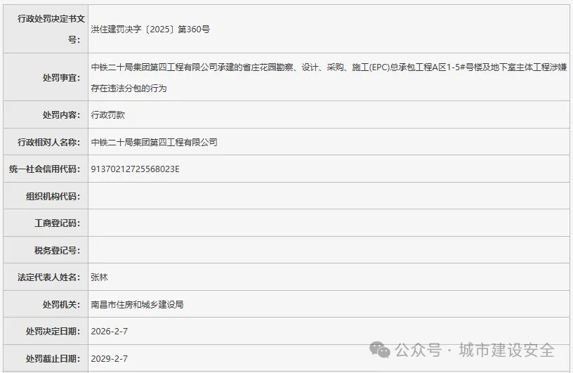 处罚事宜:中铁二十局集团第四工程有限公司承建的省庄花园勘察、设计、采购、施工(EPC)总承包工程A区1-5#号楼及地下室主体工程涉嫌存在违法分包的行为;
