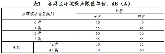 表1. 各类区环境噪声限值单位:dB(A)