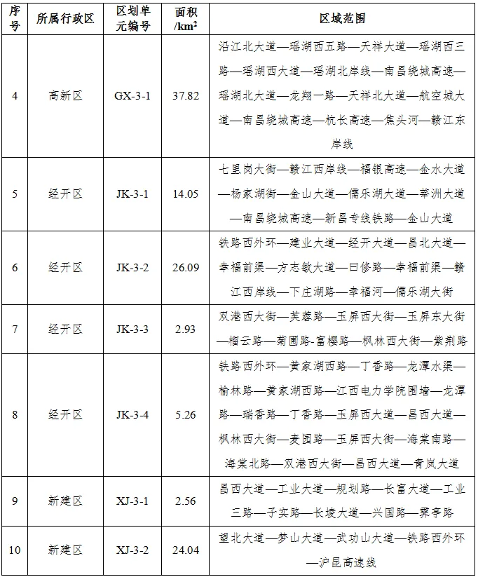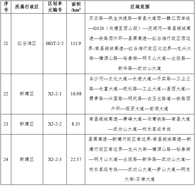 1~3类声环境功能区各区划单元编号为X-Y-Z。其中:X代表行政区,由行政区首字母组成(东湖区—DH,红谷滩区—HGT,进贤县—JX,……);Y代表声环境功能区类别代码(1类声环境功能区—1,2类声环境功能区—2,3类声环境功能区—3);Z代表区划单元序号(1,2,3……n)。