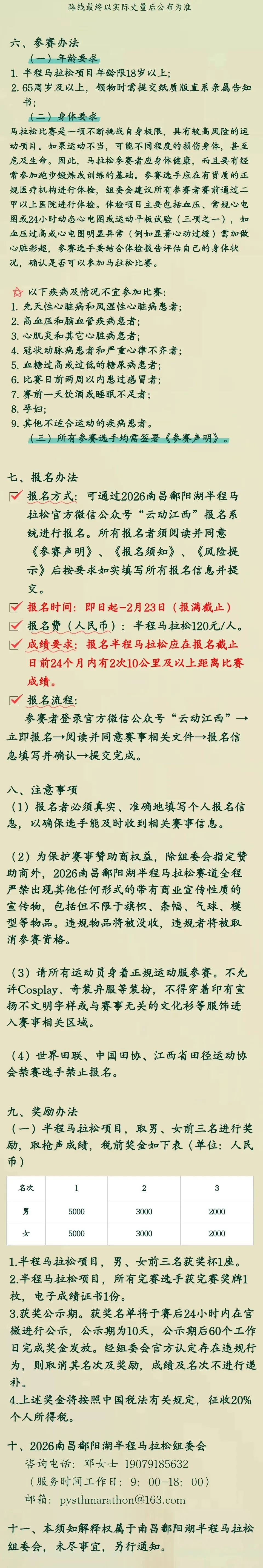 报名通道已于2月14日正式开启,报名截至2月23日,报满即止。跑者可通过赛事官方微信公众号“云动江西”报名系统完成注册与缴费。参赛要求为:报名半程马拉松的选手,须在报名截止日前24个月内,拥有2次及以上10公里(含)以上正式比赛完赛成绩。
