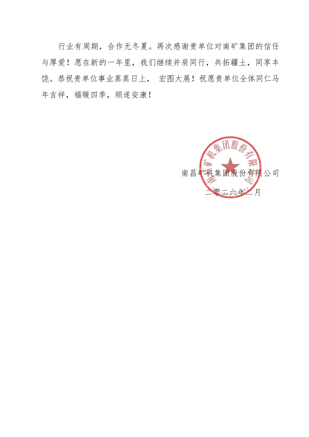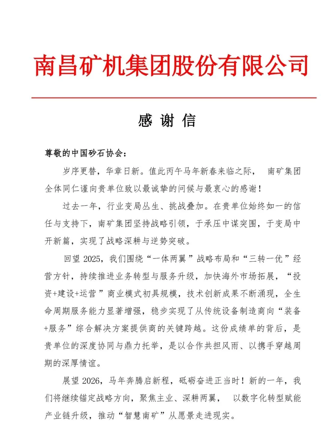 中国砂石协会收到南昌矿机集团股份有限公司的感谢信,协会对此感到十分荣幸,感谢南昌矿机集团股份有限公司在2025年为行业做出的贡献。岁启新年,华章日新。新的一年我们携手并进,再创辉煌!