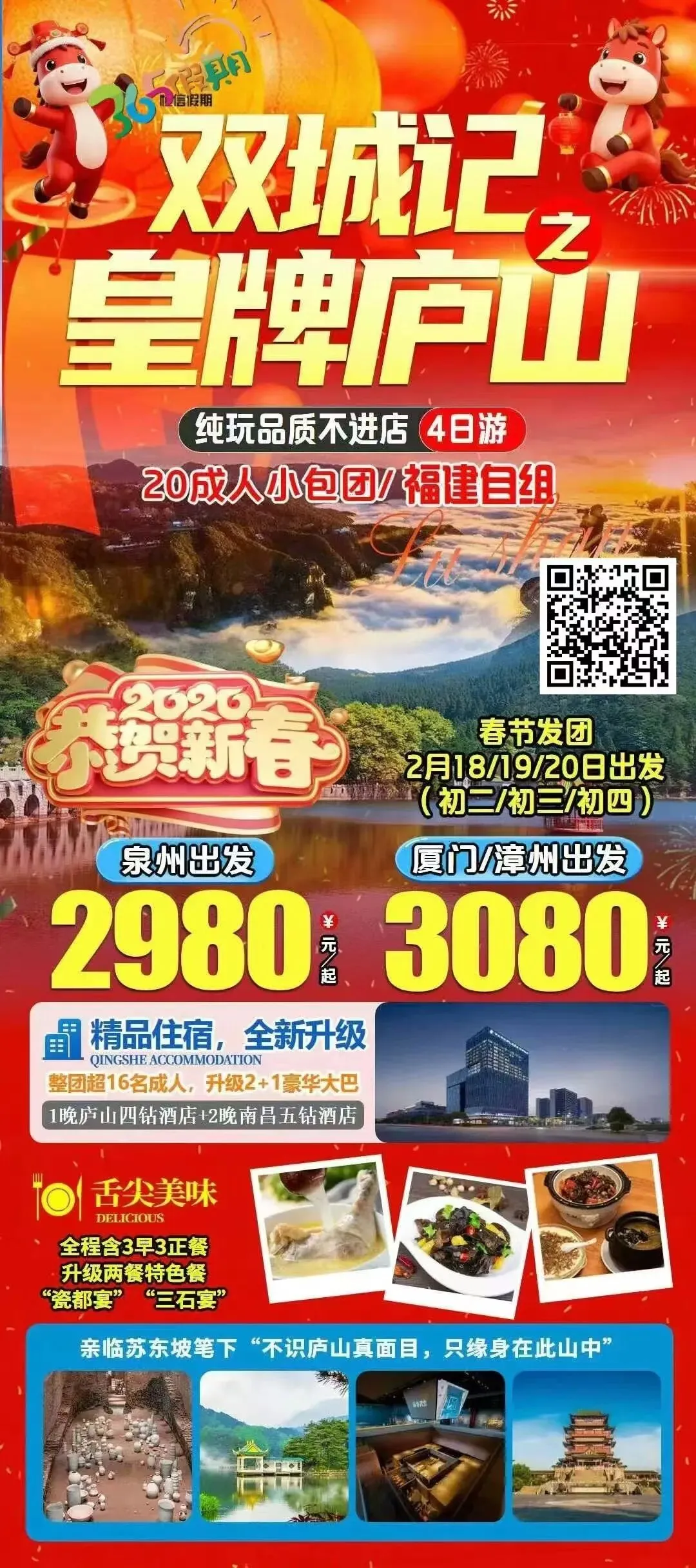 8、因是散客拼团,因个人原因不用的餐不退餐费,江西部分景区酒店用晚餐送早餐,若不在入住酒店内用晚餐,早餐需要另外购买20元/人。