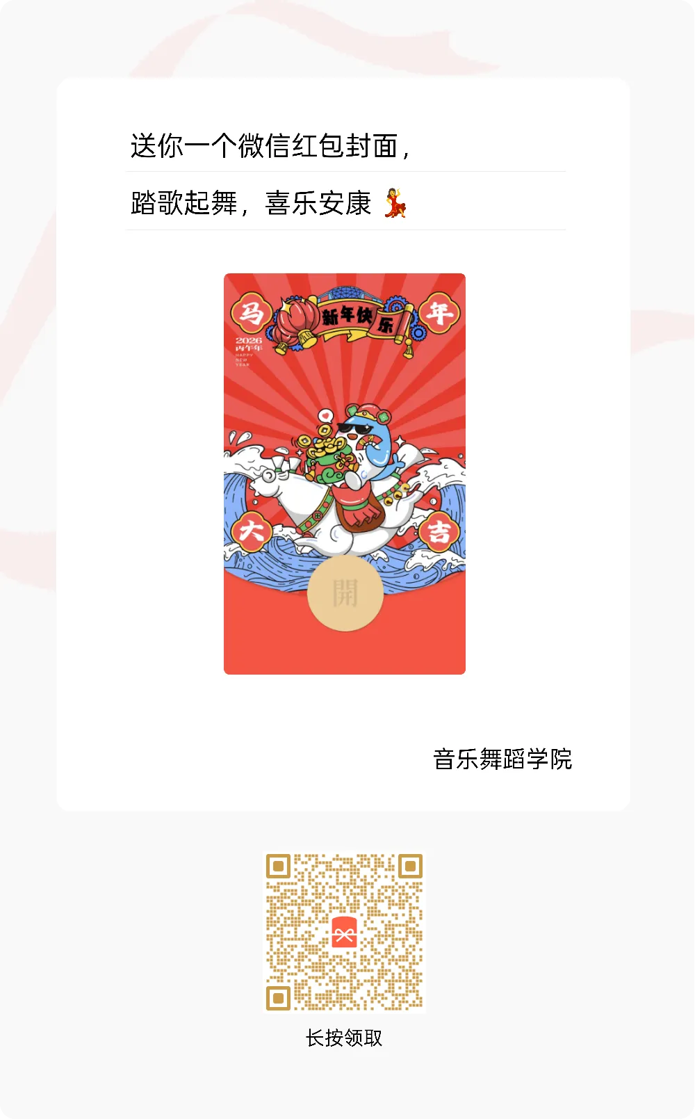 值此丙午马年新春之际,音乐舞蹈学院为全体师生、校友及各界朋友,定制了专属新春红包封面。