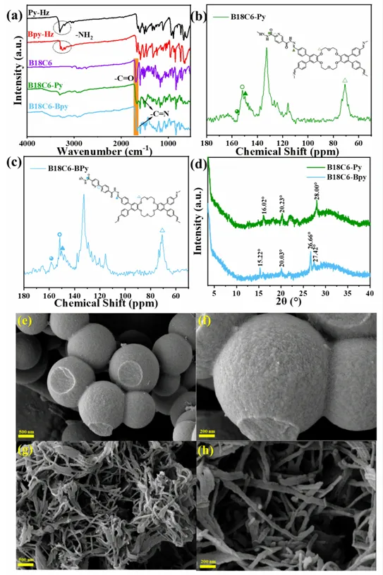 图 1. (a) Py-Hz、Bpy-Hz、B18C6、B18C6-Py 及 B18C6-Bpy 的 FT-IR 光谱;(b)(c) 分别为 B18C6-Py 和 B18C6-Bpy 的固态 CP-MAS ¹³C NMR 光谱;(d) 两者的 XRD 光谱;(e)(f) 为 B18C6-Py 的 SEM 图像(比例尺分别为 500 nm 和 200 nm);(g)(h) 为 B18C6-Bpy 的 SEM 图像(比例尺分别为 500 nm 和 200 nm)。
