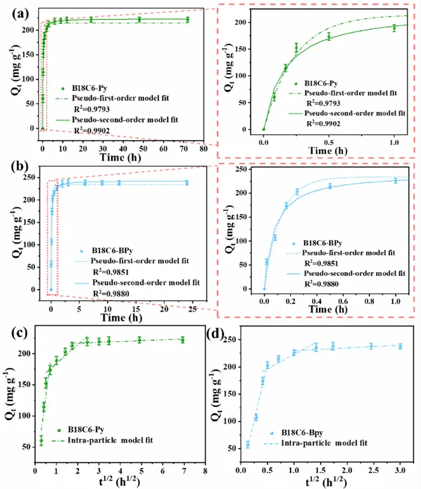 图 2. (a)(b) 分别为 B18C6-Py 和 B18C6-Bpy 的吸附动力学曲线及伪一级、伪二级模型拟合结果;(c)(d) 分别为两者吸附 Pd (II) 的颗粒内扩散模型拟合曲线(条件:pH=1;转速 200 rpm;吸附剂用量 0.2 g L⁻¹;Pd (II) 初始浓度 50 mg L⁻¹;温度 25℃)。