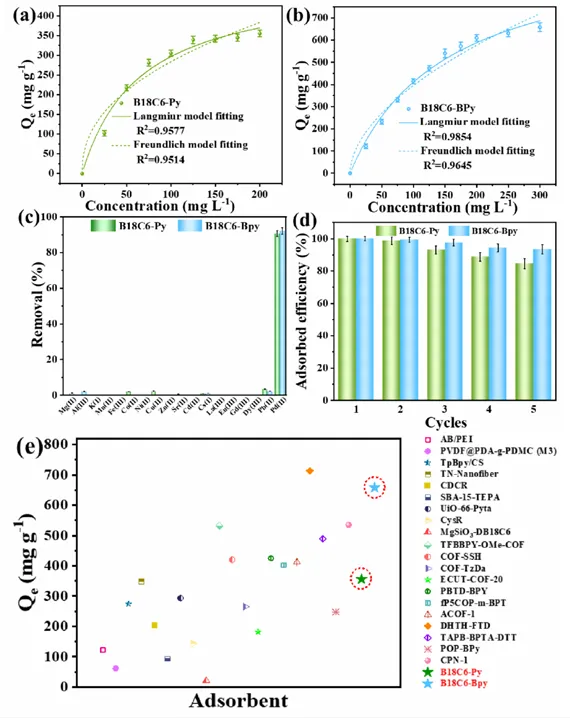 图 3. (a)(b) 分别为 B18C6-Py 和 B18C6-Bpy 的吸附等温线及 Langmuir、Freundlich 模型拟合结果(条件:pH=1;转速 200 rpm;吸附剂用量 0.2 g L⁻¹;Pd (II) 初始浓度 25-300 mg L⁻¹;温度 25℃);(c) 两者对 Pd (II) 的吸附选择性(条件:pH=1;转速 200 rpm;吸附剂用量 0.2 g L⁻¹;Pd (II) 与其他金属离子初始浓度均为 10 mg L⁻¹;温度 25℃);(d) 两者的循环使用性能(条件:pH=1;转速 200 rpm;吸附剂用量 0.2 g L⁻¹;Pd (II) 初始浓度 50 mg L⁻¹;温度 25℃);(e) 不同吸附剂对 Pd (II) 的吸附容量对比。