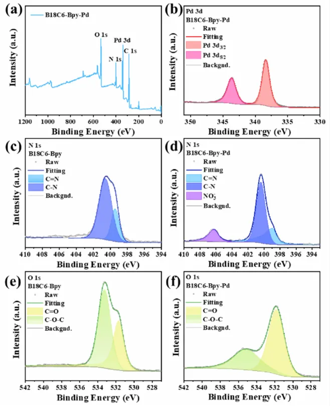 图 4. (a) B18C6-Bpy 吸附 Pd (II) 后的 XPS 全谱;(b) 吸附后 Pd 3d 的高分辨 XPS 光谱;(c)(d) 分别为 B18C6-Bpy 吸附 Pd (II) 前后的 N 1s 高分辨光谱;(e)(f) 分别为 B18C6-Bpy 吸附 Pd (II) 前后的 O 1s 高分辨光谱。