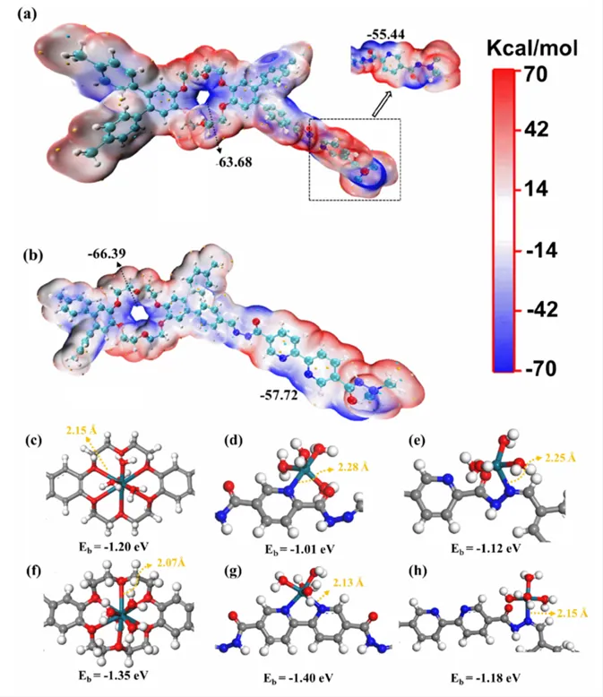 图 5. (a)(b) 分别为 B18C6-Py 和 B18C6-Bpy 电子密度表面的静电势(ESP)分布;(c)-(e) 为 B18C6-Py 与 [Pd (H₂O)₄]²⁺在冠醚、吡啶基团、酰腙键位点的相互作用结构优化结果;(f)-(h) 为 B18C6-Bpy 与 [Pd (H₂O)₄]²⁺在冠醚、联吡啶基团、酰腙键位点的相互作用结构优化结果(灰色为 C;白色为 H;蓝色为 N;红色为 O;藏青色为 Pd;距离单位为 Å)。