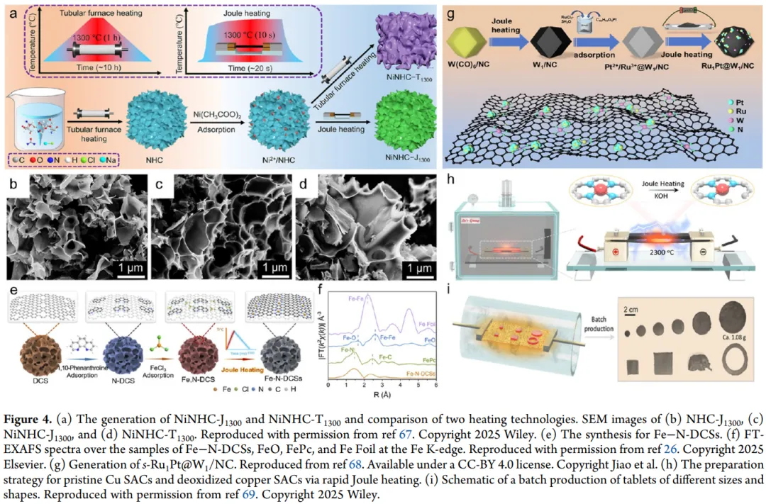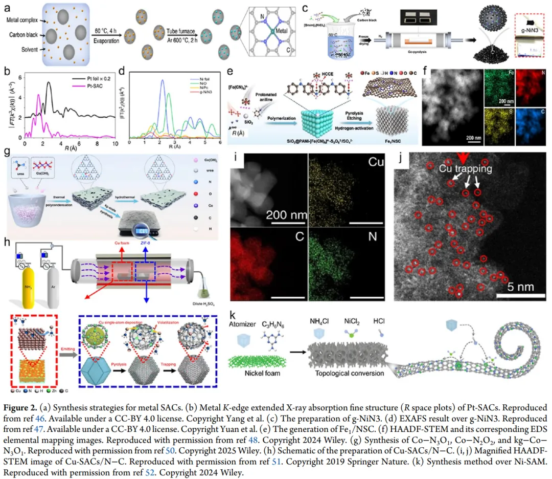 首次系统整合SACs传统规模化合成策略(热解、熔盐模板、球磨)与新兴技术(焦耳加热、微波加热、低温合成),对比分析各方法的合成条件、适用体系、核心优势与局限性,解析了不同策略调控金属原子分散状态、配位结构的关键机制。