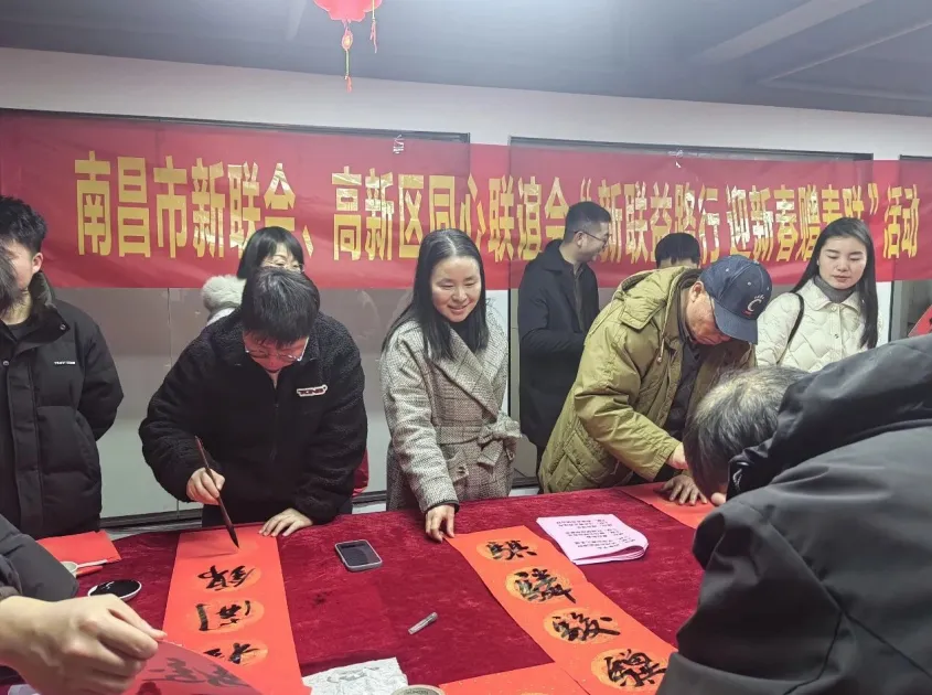 2月10日,南昌市新联会联合高新区同心联谊会举办“新联益路行 迎新春赠春联”活动。6名书法家志愿者现场书写百余副春联和“福”字,赠予社区居民,传递美好新春祝福。(南昌统一战线)