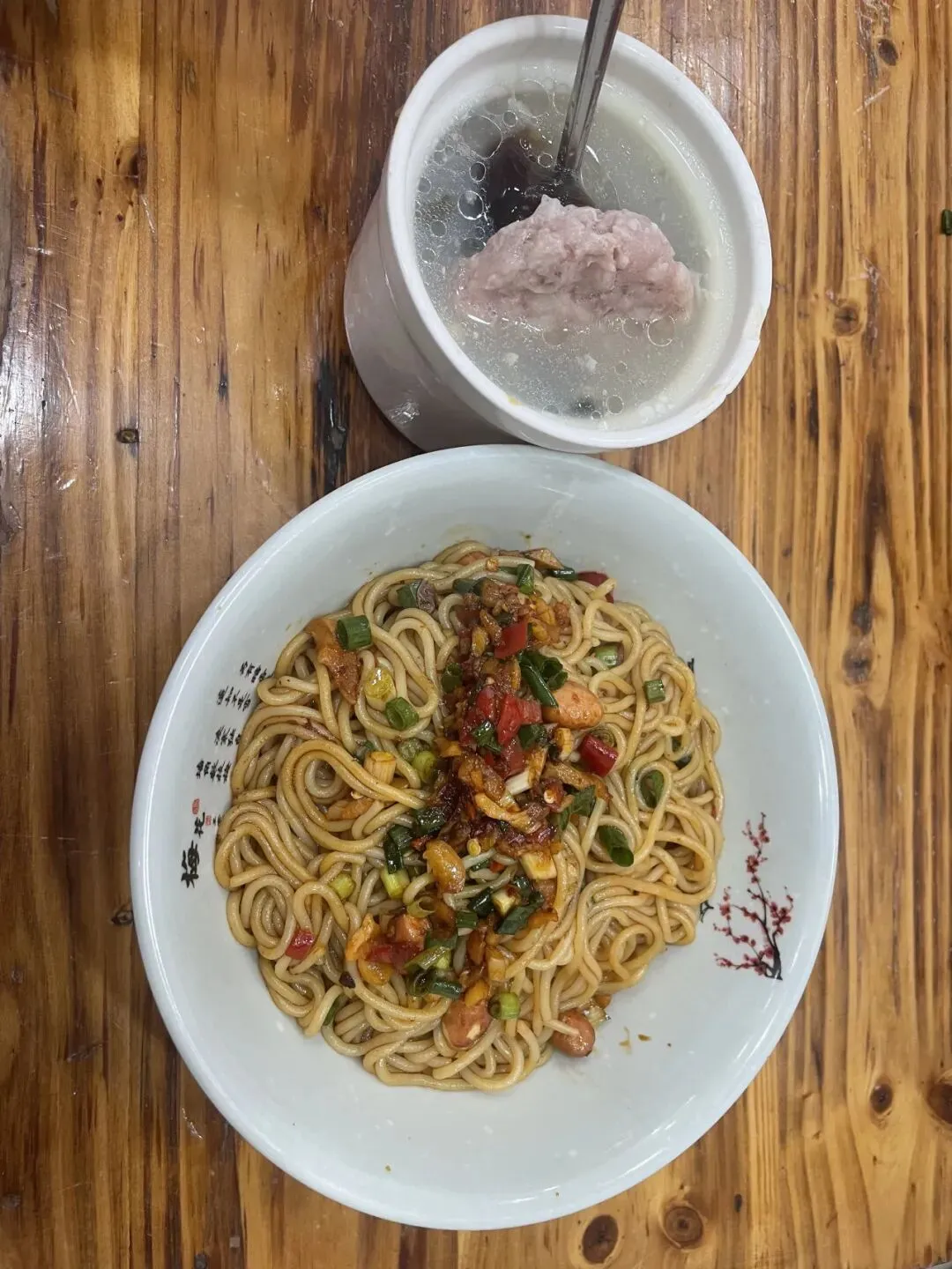 大士院很多店铺过年关了门,但有一家南昌拌粉前排着长队。饥肠辘辘的我赶紧加入,点了一碗拌粉,一碗皮蛋肉饼汤。我平时不太爱吃粉,但南昌拌粉是真的香,皮蛋肉饼汤更是鲜得让人满足。
