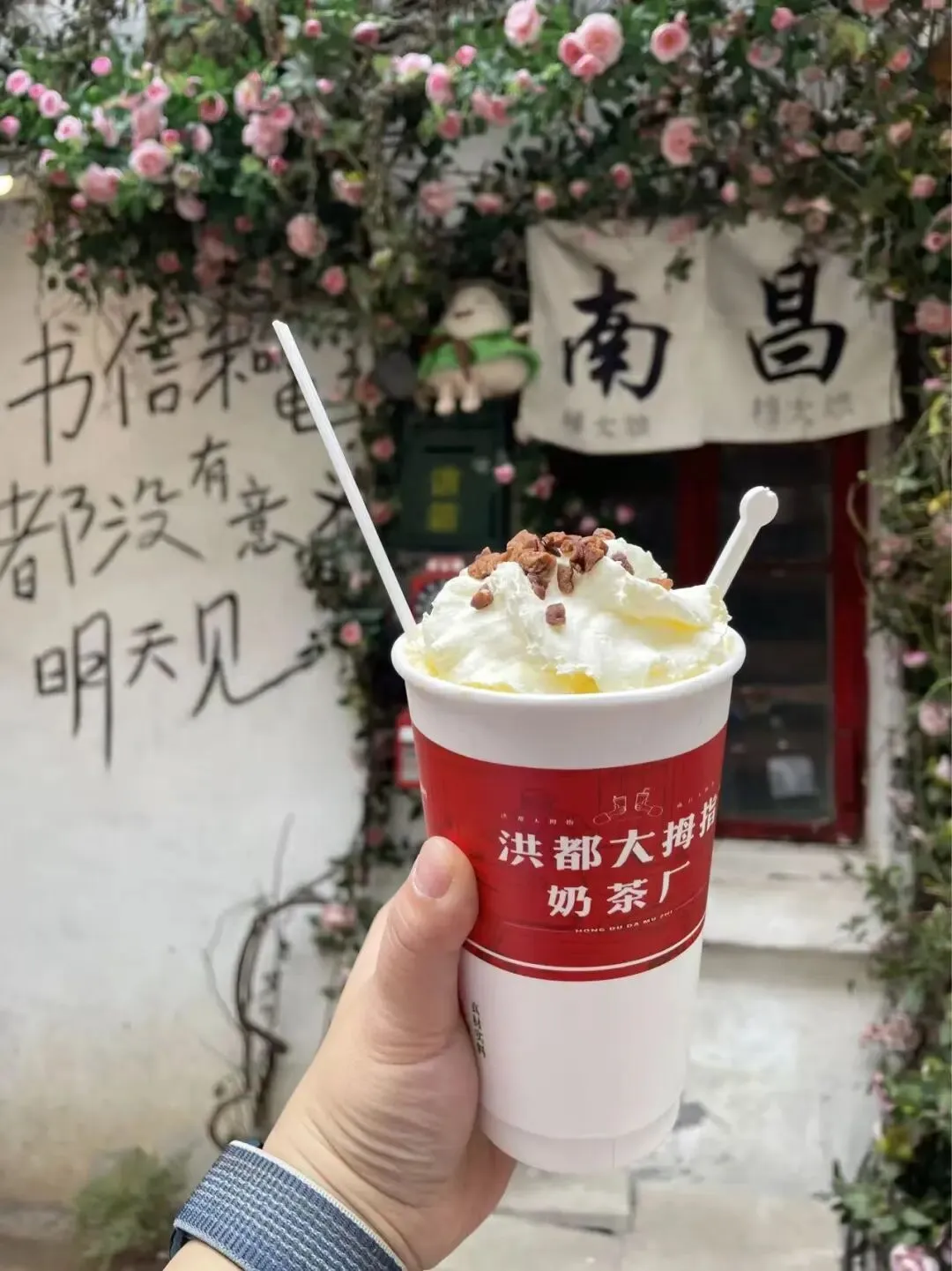 转身去了附近的珠宝街,小吃特别多。买了南昌本地的奶茶“洪都大拇指”,在奶油顶化开之前找了个好看背景拍了照,然后赶紧喝完。