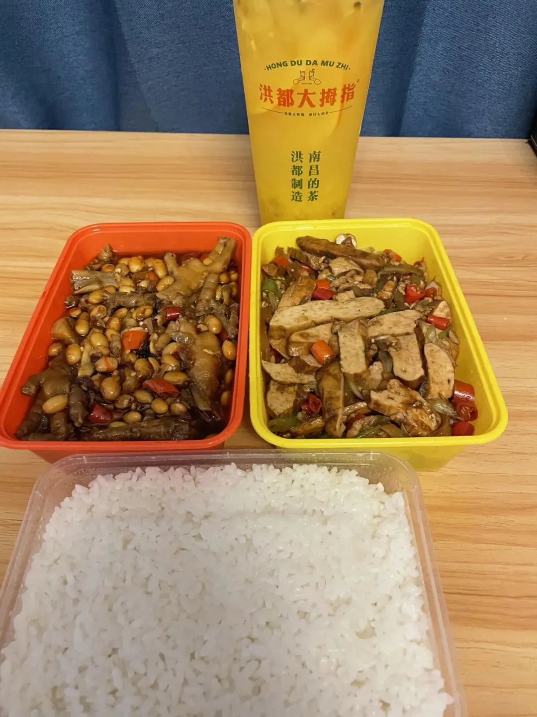 回酒店时,在地铁站附近又买了杯洪都大拇指,外卖点了黄豆鸡脚,超级好吃,就是太辣了,还好有冰果茶救场。