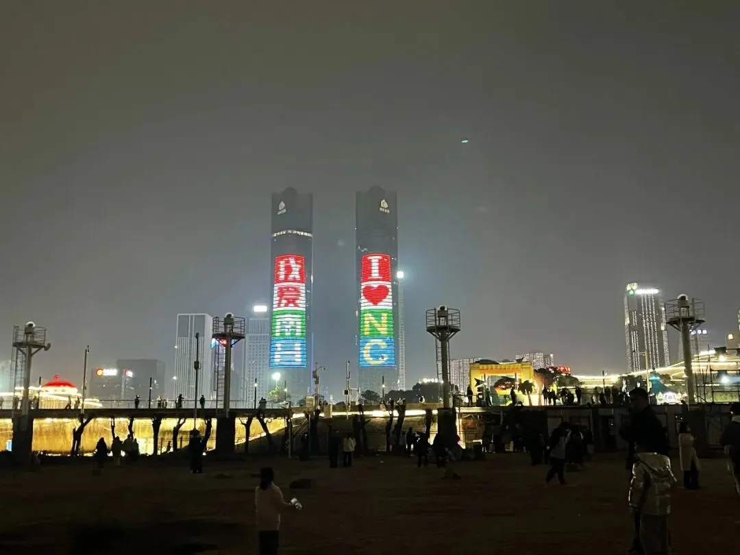 结束后没急着走,走到赣江边,掬一捧江水。好多小孩在用沙子堆城堡。也看到远处滕王阁夜景。离开时,拍了双子塔,灯光拼出“我爱南昌”四个字。