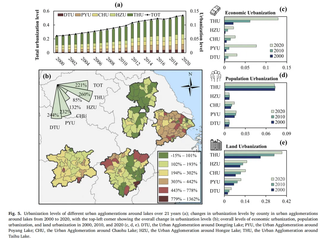 快速城镇化正在重塑中国大湖区:景观破碎、湿地退化、生态韧性下降,成为威胁湖区可持续发展的核心问题。厘清大湖区生态韧性对城镇化的响应机制,不仅关系到湖区生态精准调控与区域适应能力提升,也直接服务于美丽中国与韧性城市建设的关键科学任务。因此,本研究旨在回答以下核心问题:城镇化对中国五大湖区生态韧性的直接影响和空间外部性是否存在差异?在距离湖泊远近不同的空间位置,城镇化对生态韧性的影响是否存在显著差异?