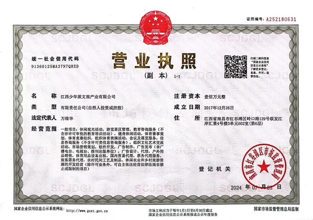 阳光少年派成长营成立于2016年,是江西最早一批开展营地教育及研学夏令营的机构之一,经过近10年的发展,现已完善各类资质与保障体系。阳光少年派为江西少年派文旅产业有限公司注册商标,同时下设全资子公司江西复兴国际旅行社有限公司进行研学业务落地与执行,为青少年研学游学夏令营保驾护航,为青少年活动提供完善的旅行社责任险及高额活动意外保险等双重保险。