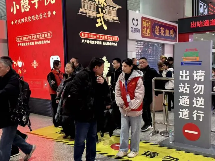 春运路上,一抹抹“志愿红”成为英雄城最动人的风景。红谷滩区的“红小青”志愿者在南昌西站为旅客提供秩序引导、咨询帮扶等服务,来自景德镇学院的郎旷芊在帮扶腿脚不便的老人、为港澳同胞指路后深有感触:“‘为人民服务’从来不是一句简单的口号,而是弯腰帮扶时的一份真诚,是耐心倾听时的一份用心。”同在南昌西站服务的江西科技师范大学学生涂佳焱,面对返程高峰旅客一遍遍“地铁往哪走”“换乘怎么走”的询问,始终耐心指引、抬手示意,从未有过一丝懈怠。