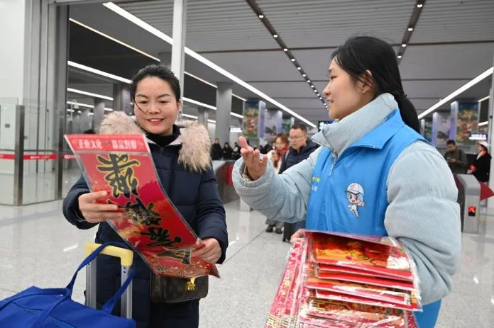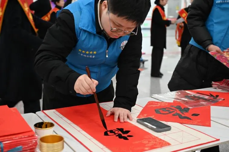 东湖区的青年志愿者们用特别的方式传递新春暖意——他们在车站书写赠送福字、开展互动写福活动,并同步进行反诈普法趣味问答,赠送新春香囊、发放宣传手册,将平安与祝福一同送到旅客手中。