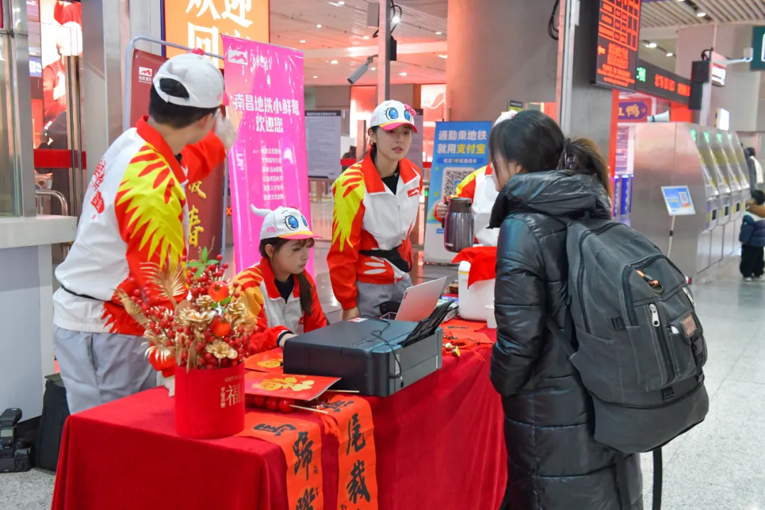 南昌地铁“小鲜鹭”志愿者主动奔赴地铁大厦站、万寿宫站、南昌西站等客流密集的重点车站,积极为乘客提供引导咨询、秩序维护、行李帮扶、应急救助等贴心服务,全力保障春运出行安全,同时结合新春氛围,创新开展“小鲜鹭帮你拍”定格美好瞬间、新春送春联、温暖回家茶等特色专题活动,将年味与关怀送到旅客身边,用实际行动传递城市温度,截至目前,“小鲜鹭”春运志愿服务累计参与260人次,服务总时长2080小时,服务乘客15万人次。